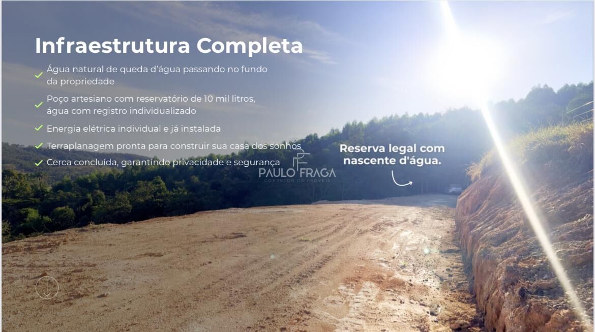 POSSUI QUEDA D'ÁGUA PASSANDO NO FUNDO DA PROPRIEDADE, POÇO ARTESIANO COM RESERVATÓRIO PARA 10 MIL LITROS DE ÁGUA COM REGISTRO INDIVIDUALIZADO, ENERGIA ELÉTRICA, TERRAPLANAGEM PRONTA PARA CONSTRUÇÃO, CERCA CONCLUÍDA, RESERVA LEGAL DA PROPRIEDADE.