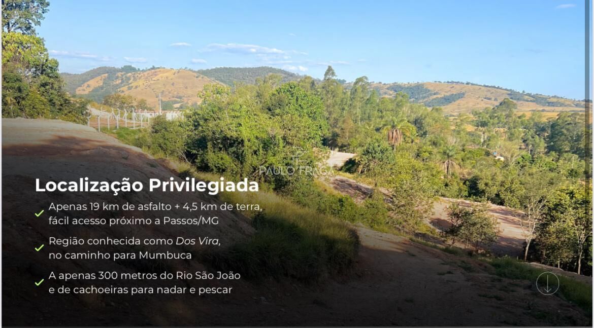 ÁREA RURAL COM 2500M2 LOCALIZAÇÃO PRIVILEGIADA, 19KM DE ASFALTO, MAIS 4,5 DE TERRA, ACESSO FÁCIL A CIDADE DE PASSOS. ESTÁ APENAS HÁ 300 METROS DO RIO SÃO JOÃO E DE CACHOEIRAS.
